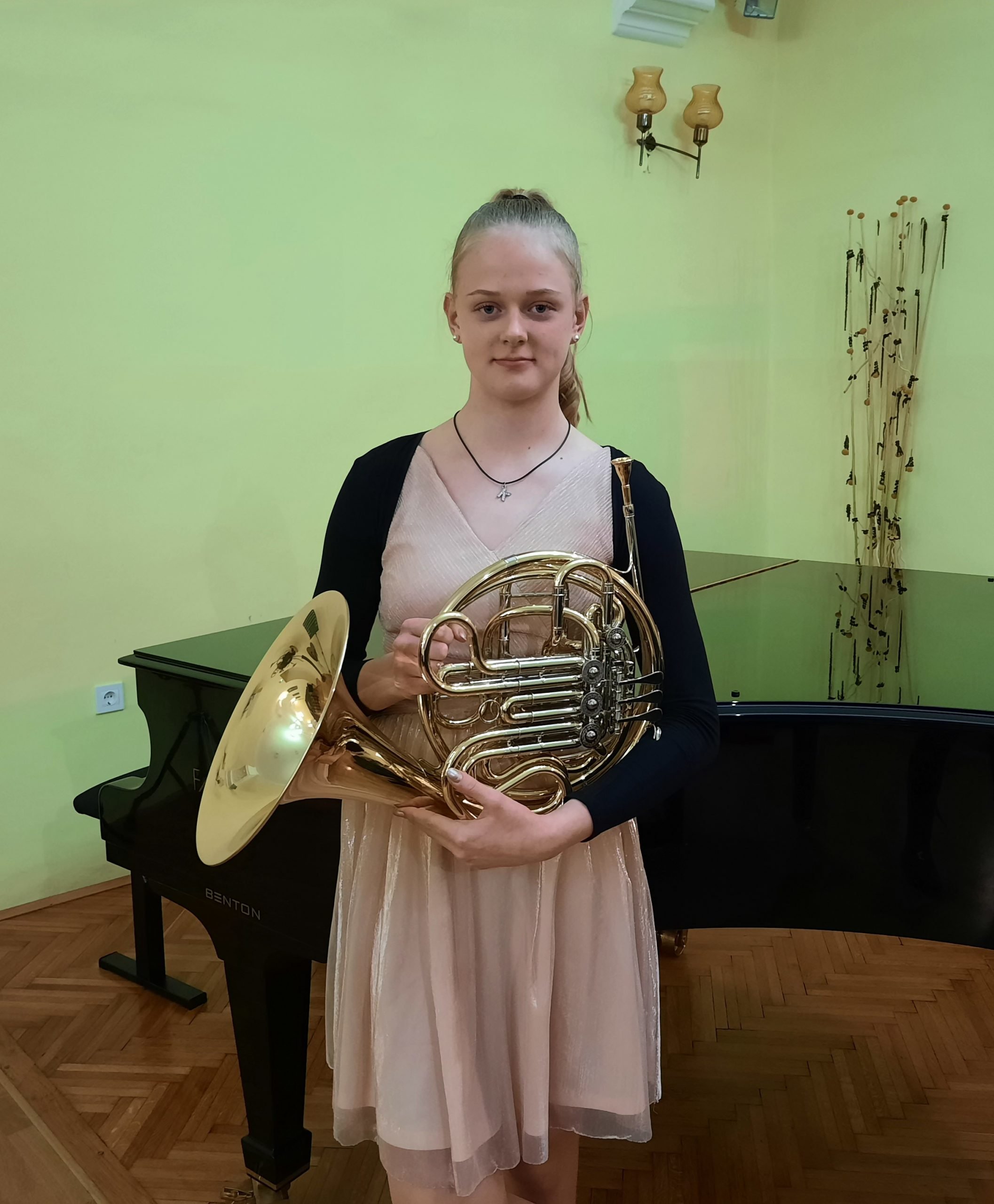 Učenka roga Katarina Simonič tudi v času epidemije pridno muzicira. V marcu se je udeležila mednarodnega internetnega tekmovanja v Nici in dosegla 93 točk ter SREBRNO PLAKETO. Na tekmovanju je zaigrala s korepetitorjem Tomom Hajškom in pod mentorstvom Helene Bezjak.
